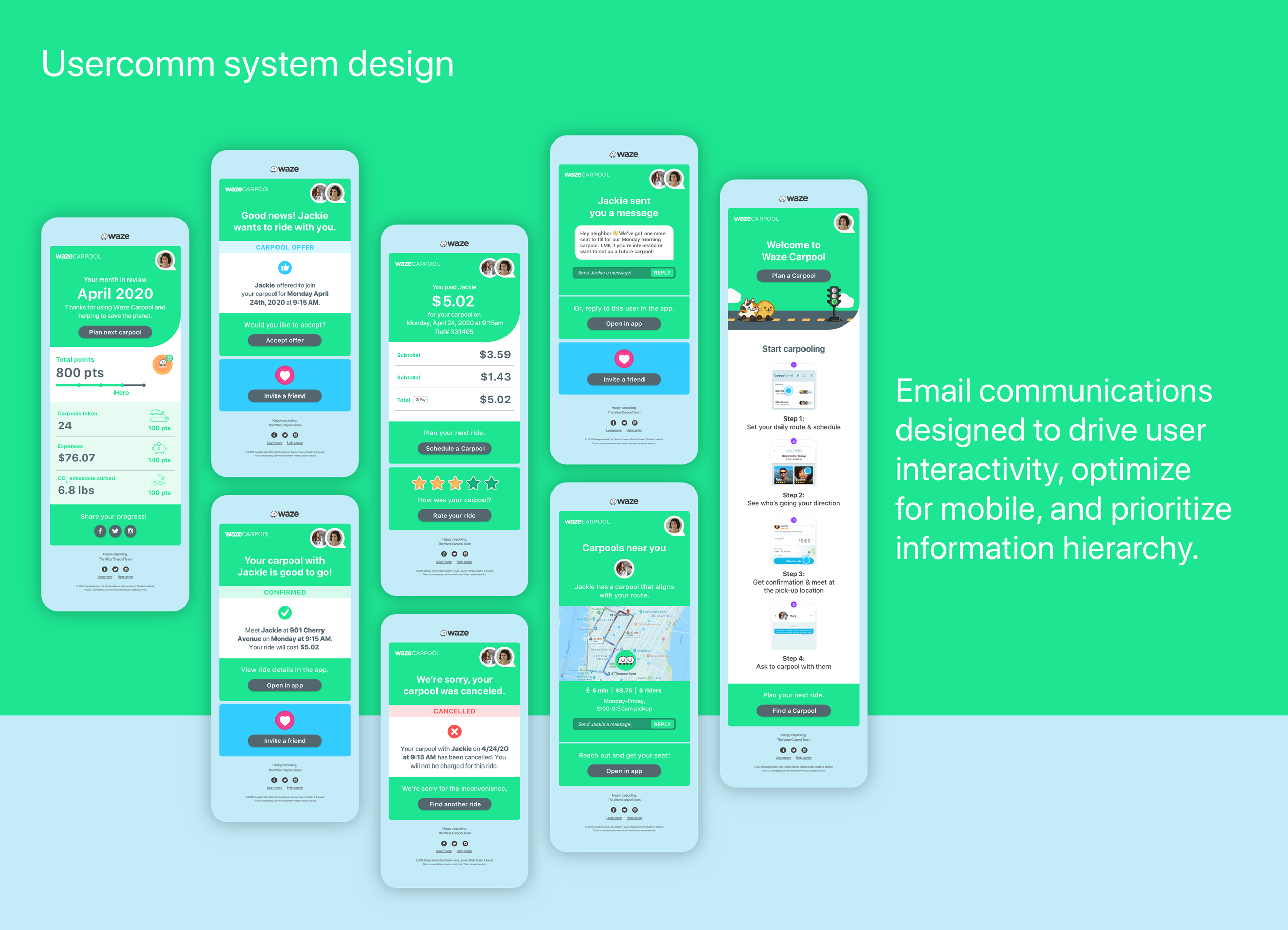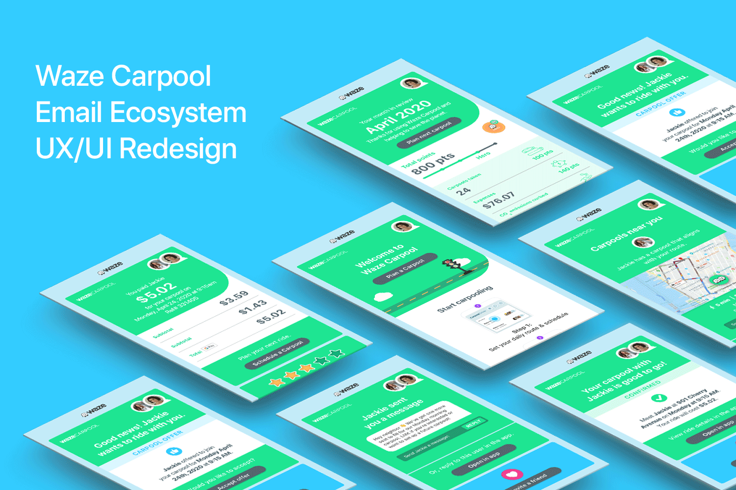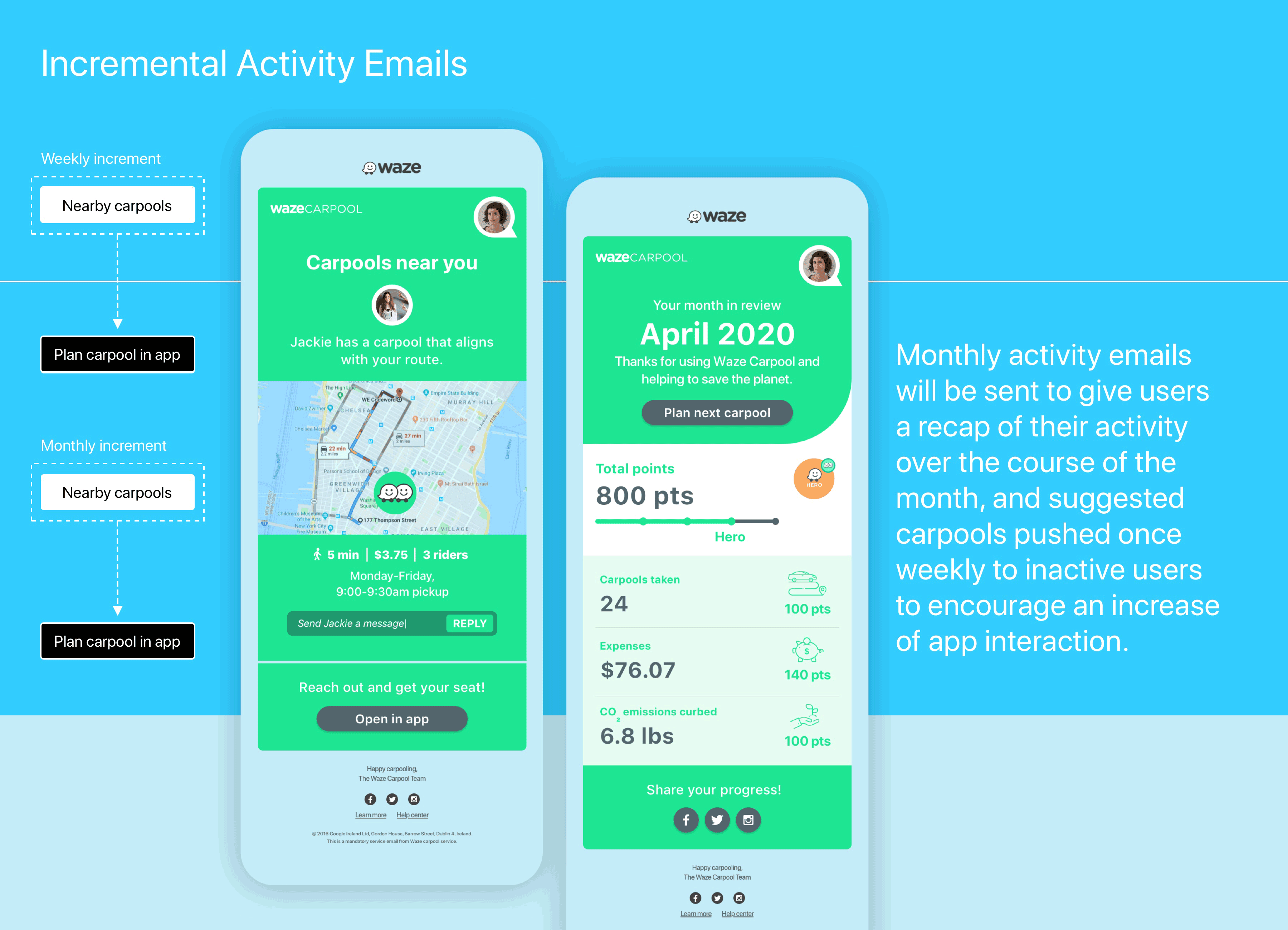 Our client approached us to create a series of email usercomms for the Waze carpool app. We sought to optimize the Carpooling experience with this series of comprehensive emails to supplement in-app action and push app interactivity. Our team explored concepts such as gamification and data summarization to make the email experience as personal and engaging as possible.